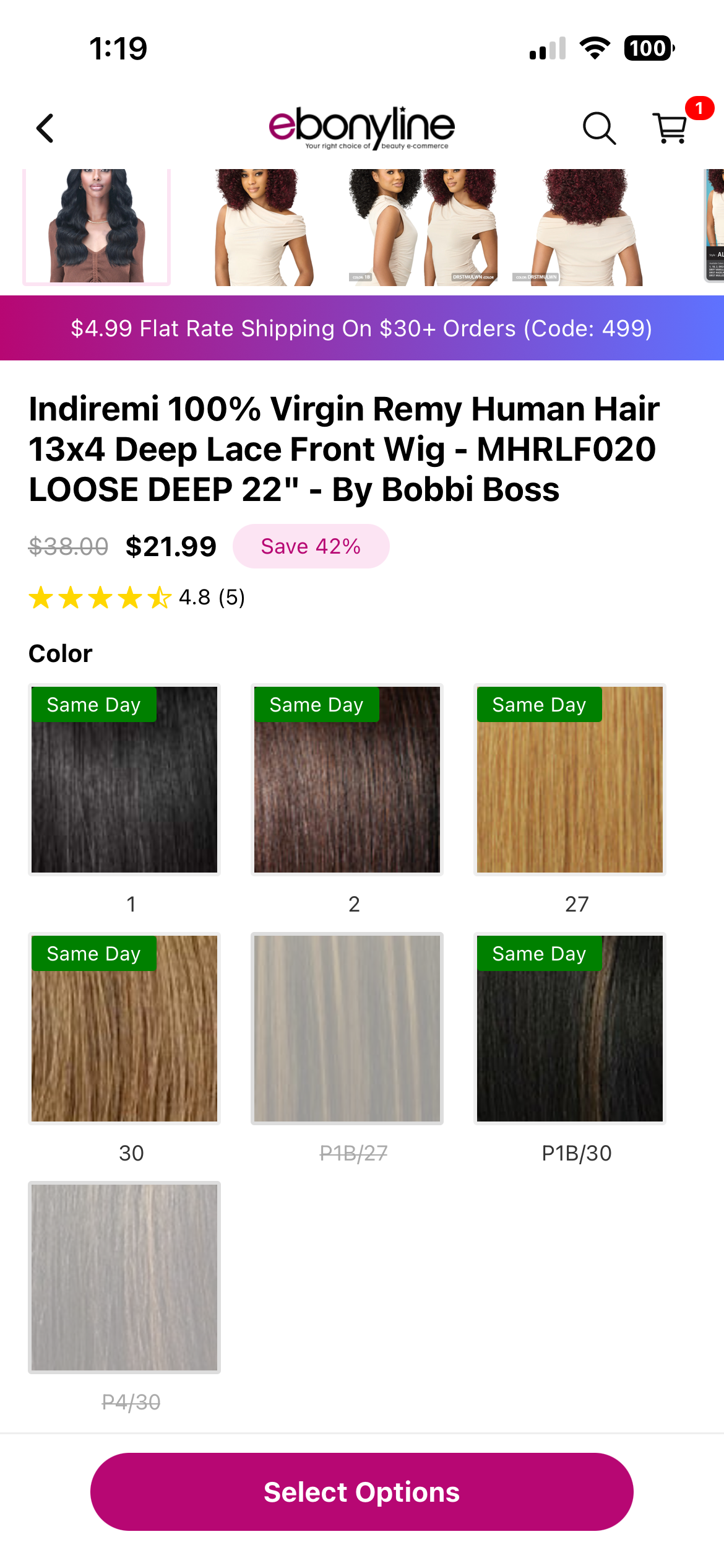 A complete product detail interface supporting multiple variants, availability indicators, shipping-time badges, ratings, rich descriptions, and cross-sell recommendations.