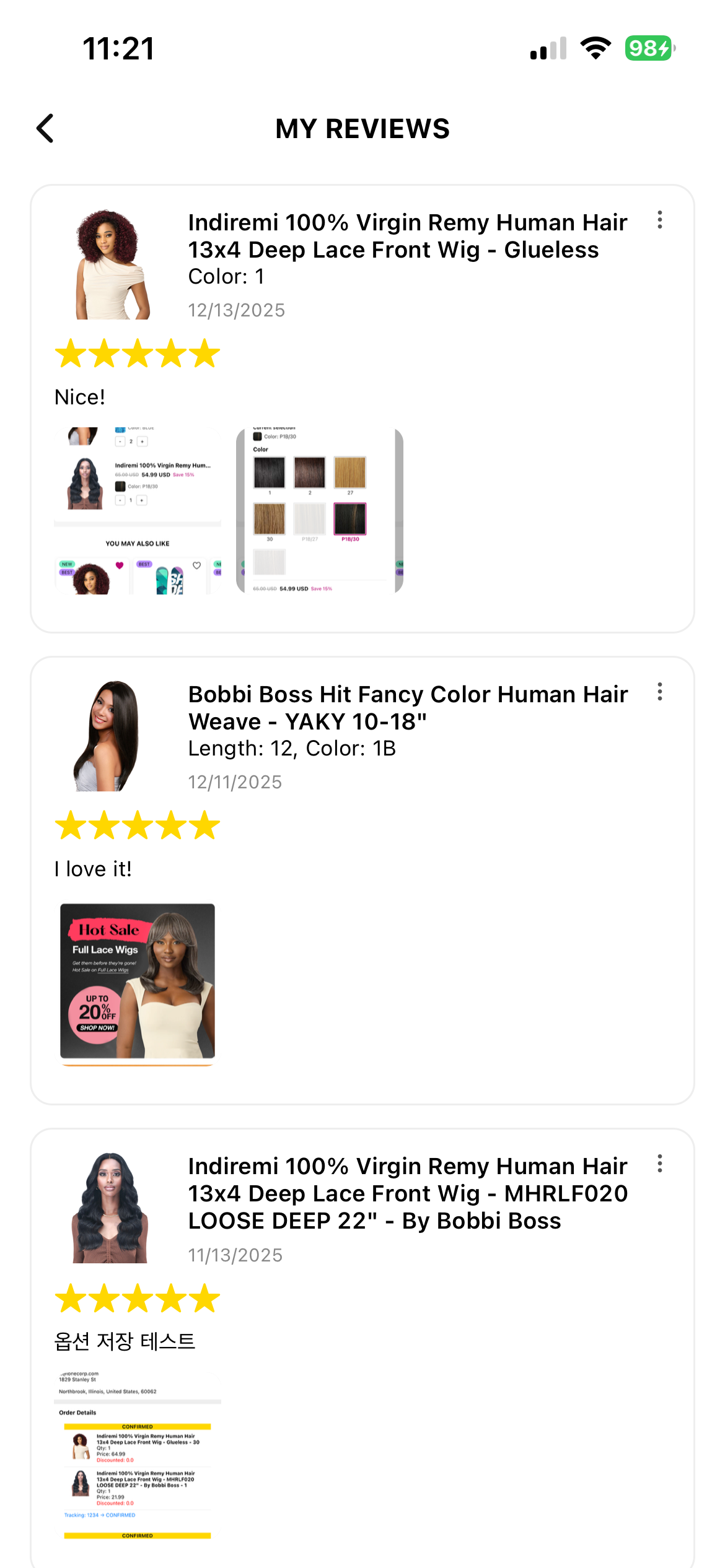 A full user-generated content flow allowing customers to create, upload, view, and remove reviews including media.