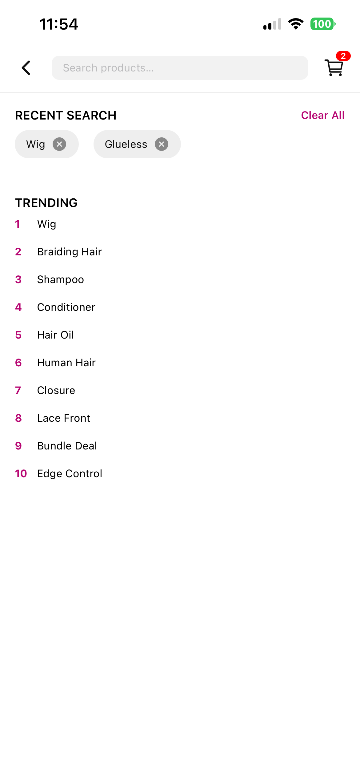 A responsive search experience featuring recent search history, trending queries, structured filters, and an optimized product grid capable of rendering large result sets smoothly.