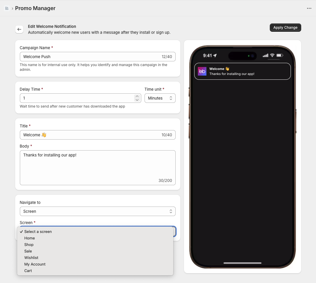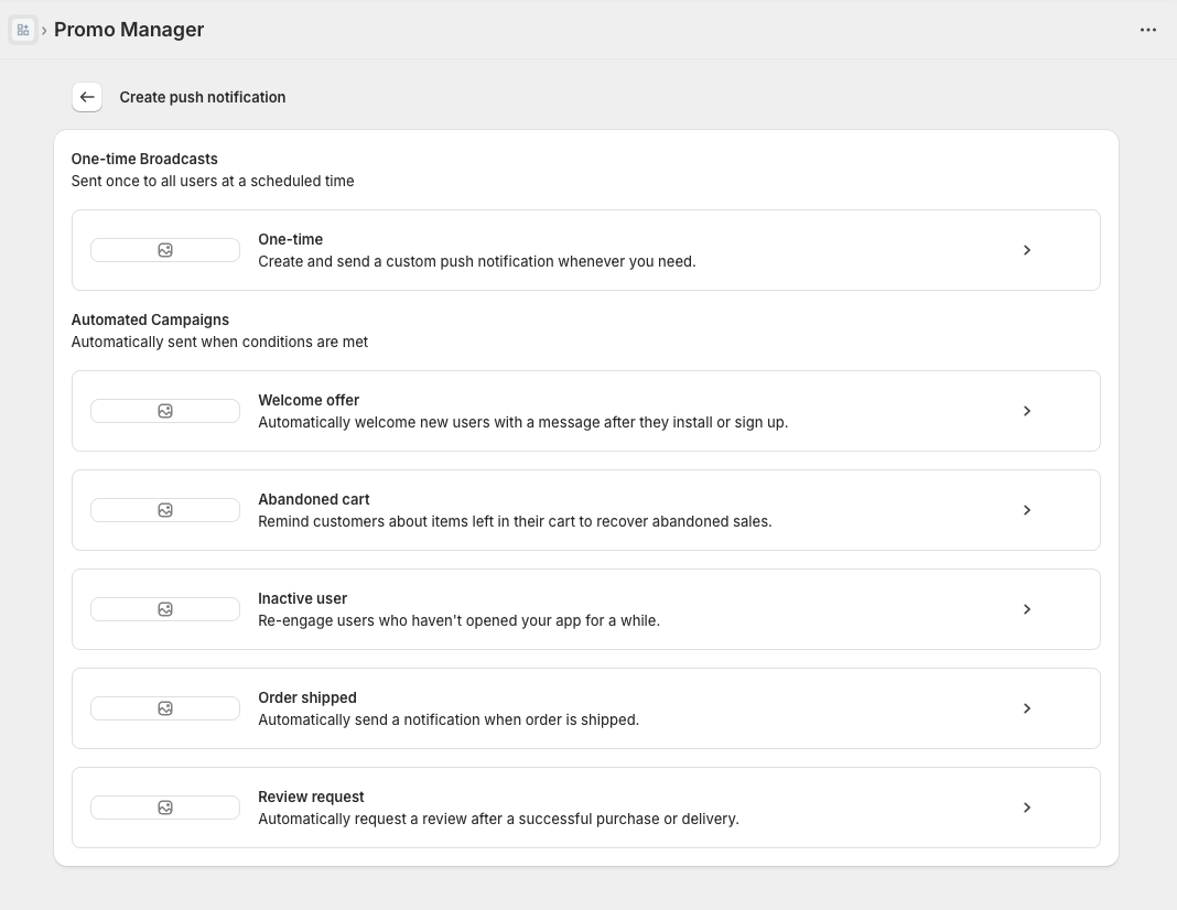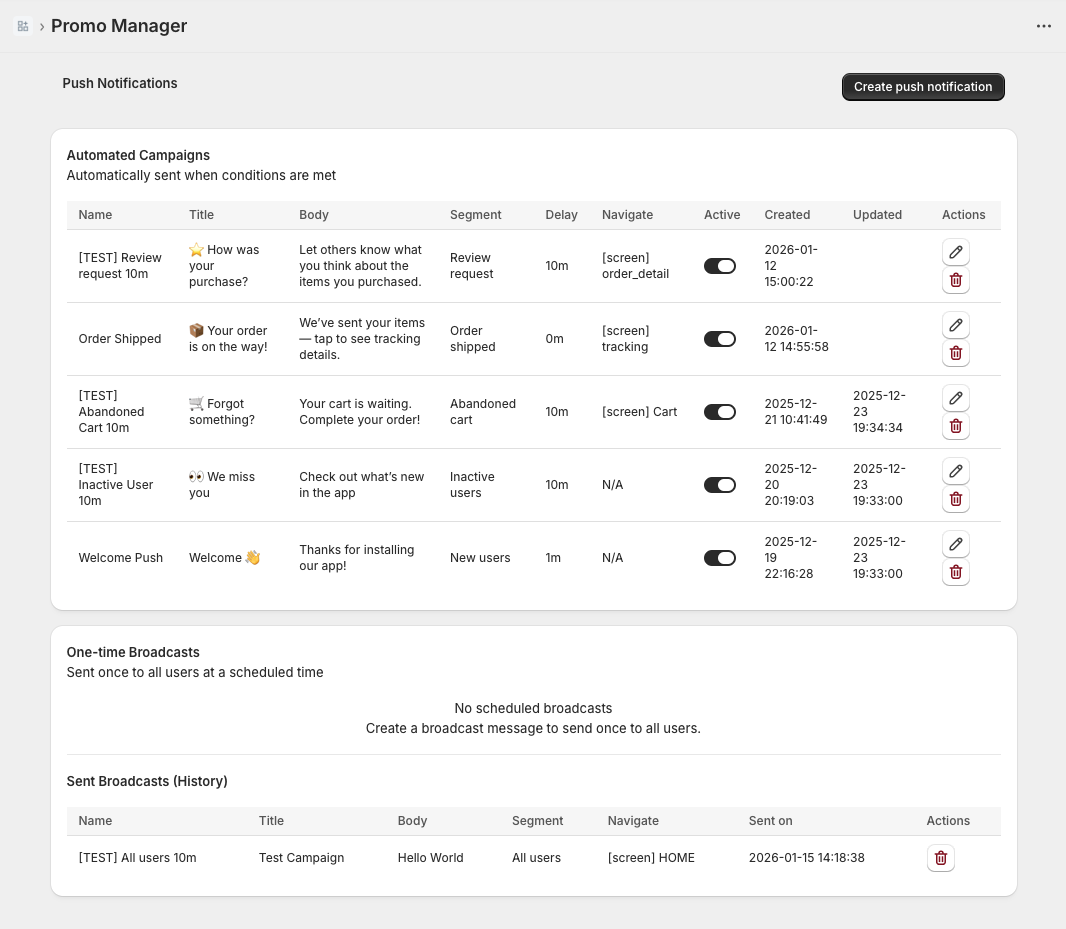 Merchant-managed push notifications with deep-link navigation support, including full CRUD, enable/disable controls, and live previews from the admin interface.