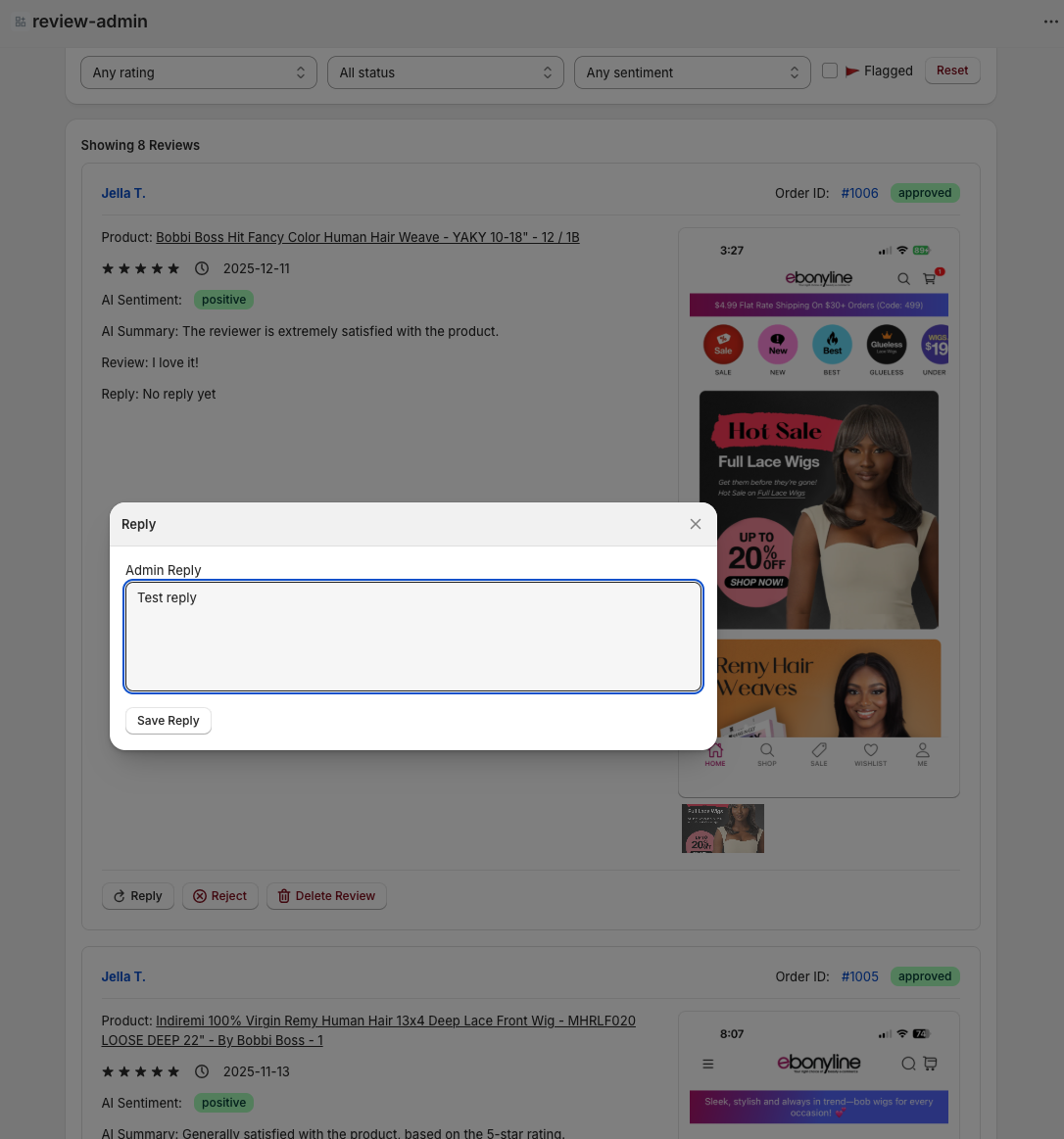 The system synchronizes review data with the store’s platform and supports scalable workflows that mirror real-world e-commerce moderation tools.